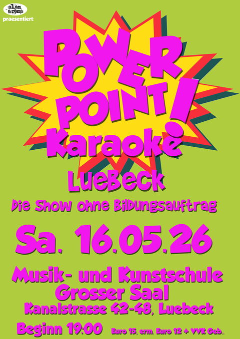 Kommt vorbei, lasst euch überraschen und erlebt eine chaotische, aber geniale Show in der unserer neuen Location der Musik & Kunstschule Lübeck in der Kanalstrasse. Du hast Lust bei Powerpoint Karaoke Lübeck selbst auf die Bühne zu steigen und bei einer Präsentation mitzumachen. Super!! melde dich einfach per mail bei: tilostrauss@slamarama.de Markiert euch den Termin und seid dabei – Tickets gibt’s wie immer bei @luebeck_ticket oder auf www.slamararama.de.