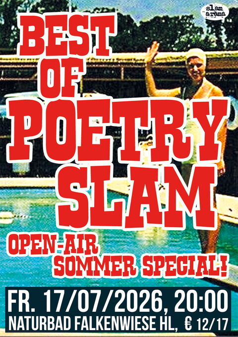 Der Slam A Rama Poetry Slam geht nach draußen! Natürlich nicht irgendwo hin, sondern in Lübecks bezaubernden Flußbad Falkenwiese. Ein erstklassiges Line-up der Dichter und Denker der neuen Generation wird sich unter freiem Himmel vor der wunderbaren Lübecker Freibadkulisse mit ihrer Wortkunst in eure Herzen und Gehörgänge reimen und wortspielen und euch in den Sonnenuntergang begleiten. In einer einzigartigen Mischung aus Literatur und Performance stellen sich die Wortakrobaten einer Publikumsjury und kämpfen um die güldene Slam Trophäe des Abends. Also Beine in die Hand, Ohren auf und zu uns gerauscht. Wir freuen uns schon riesig auf euch und diesen besonderen Slam Abend! Mit den Topp Poet:innen: Jesko Habert, Simeon Buß, Slam Team: Klara & Luke, Aileen Schneider. Musik: Bjarne.
