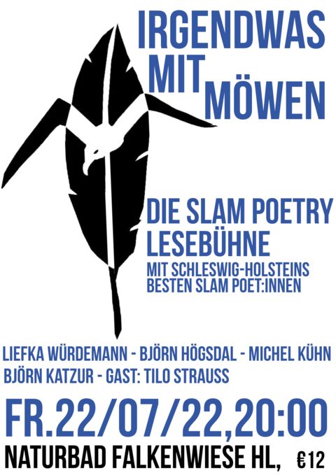 Die Kult-Lesebühne Irgendwas mit Möwen vereint die Crème de la Créme der schleswig-holsteinischen Poetry Slam Szene und präsentiert ein Bühnenprogramm mit den besten Texten der vergangenen Jahre. Irgendwas mit Möwen ist die erste regelmäßige Lesebühne Schleswig-Holsteins aus der Poetry Slamszene! Irgendwas mit Möwen präsentiert Slampoetry, literarisches Kabarett, Kurzgeschichten und Liedermaching aus eigener Aufzucht, erzeugt von freilaufenden AutorInnen und gefüttert mit den Absurditäten des Alltags. Poetisches und Prosaisches, Komisches und Kurioses, Tragisches und Temperamentvolles wird expressiv auf die Bühne gebracht. Bei dieser Open Air Veranstaltung ist der Zuschauerbereich überdacht. Mit: Liefka Würdemann, Björn Katzur, Björn Högsdal, Michel Kühn, musikalischer Gast: Tilo Strauss.